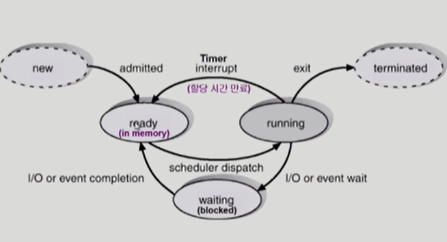 - 메모리에 적재된 프로세스(ready)가 CPU 제어권을 가질 때 실행 상태(running)에 있다고 한다.
