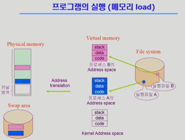 - 이후 다른 글에서 다뤄야겠지만, 프로그램이 실행될 때(프로세스) 독자적인 논리적인 메모리 주소 공간을 가지며 코드, 데이터, 스택으로 이루어져 있다. 물리적인 메모리를 효율적으로 사용하기 위해 프로세스별 논리 메모리의 일부만 실제 메모리에 적재하여 사용한다. (가상메모리 기법)