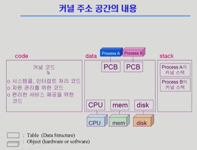 - 커널도 독자적인 주소 공간을 가지며, 인터럽트 혹은 시스템 콜이 발생할 때 커널 모드의 주소 공간의 코드 영역에 저장된 커널 코드를 호출하며 동작한다.