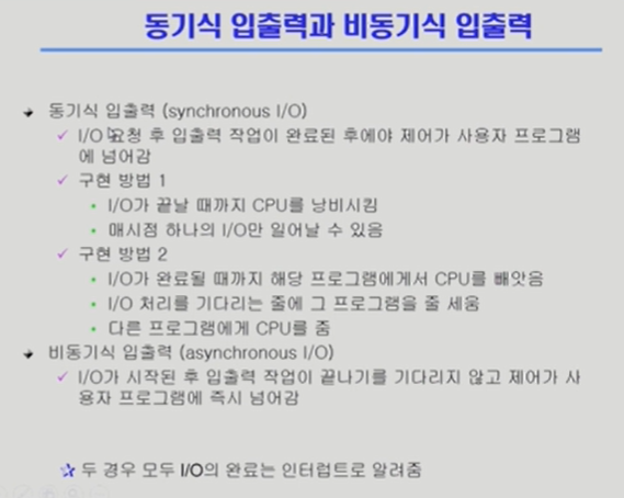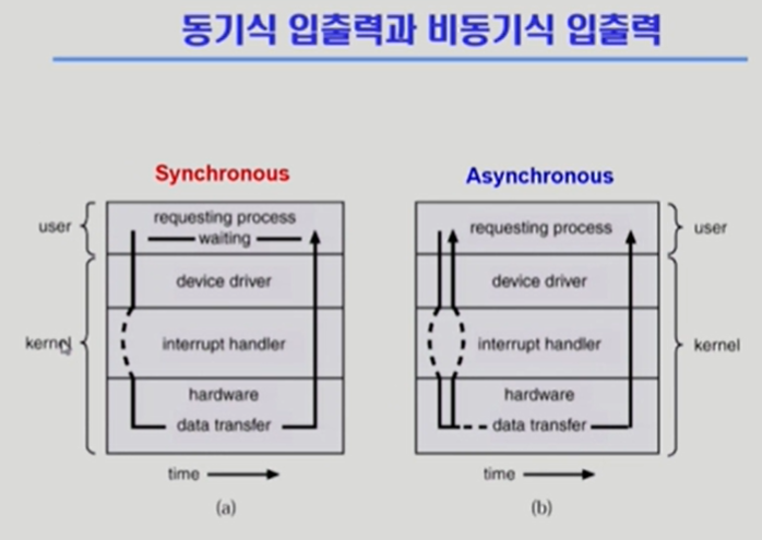 * 프로세스가 입출력이 진행되는 동안에 cpu를 가지고 있든 가지고 있지 않든 instruction을 실행할 수 있는가. 실행하지 않고 기다리면 (입출력이 끝난 후 진행)동기식 입출력, 끝난 여부와 상관없이 진행되면 비동기식 입출력