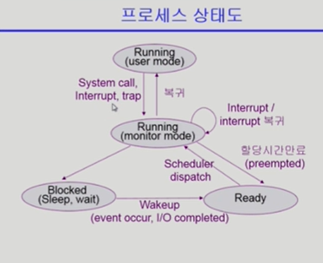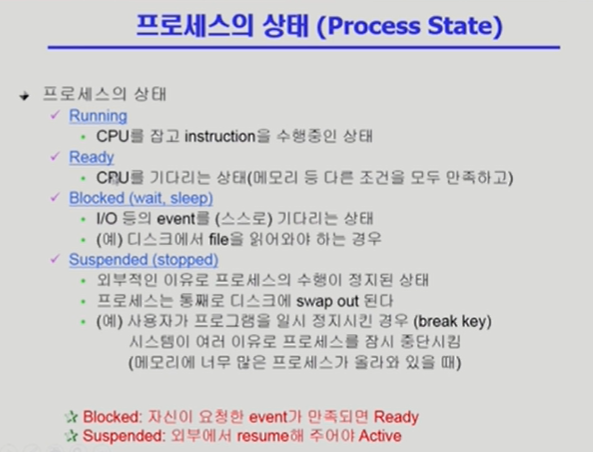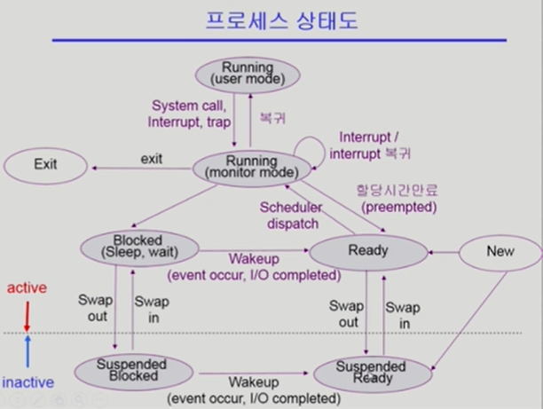 * blocked: 자기 자신에 의해 발생하며 i/o 작업 등 커널 모드가 필요할 경우. 이벤트 처리 이후 다시 ready