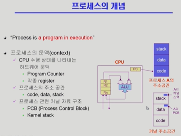 프로세스는 메모리에 올라가서 사용자에 의해 컴퓨터 상에서 '실행 중인 프로그램'을 의미하며