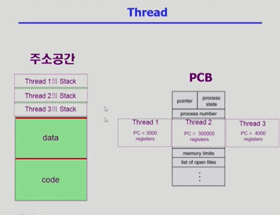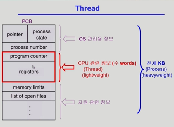 * 커널 스레드: 프로세스 안에 스레드가 몇개 있는지 운영체제 커널이 알고 있음